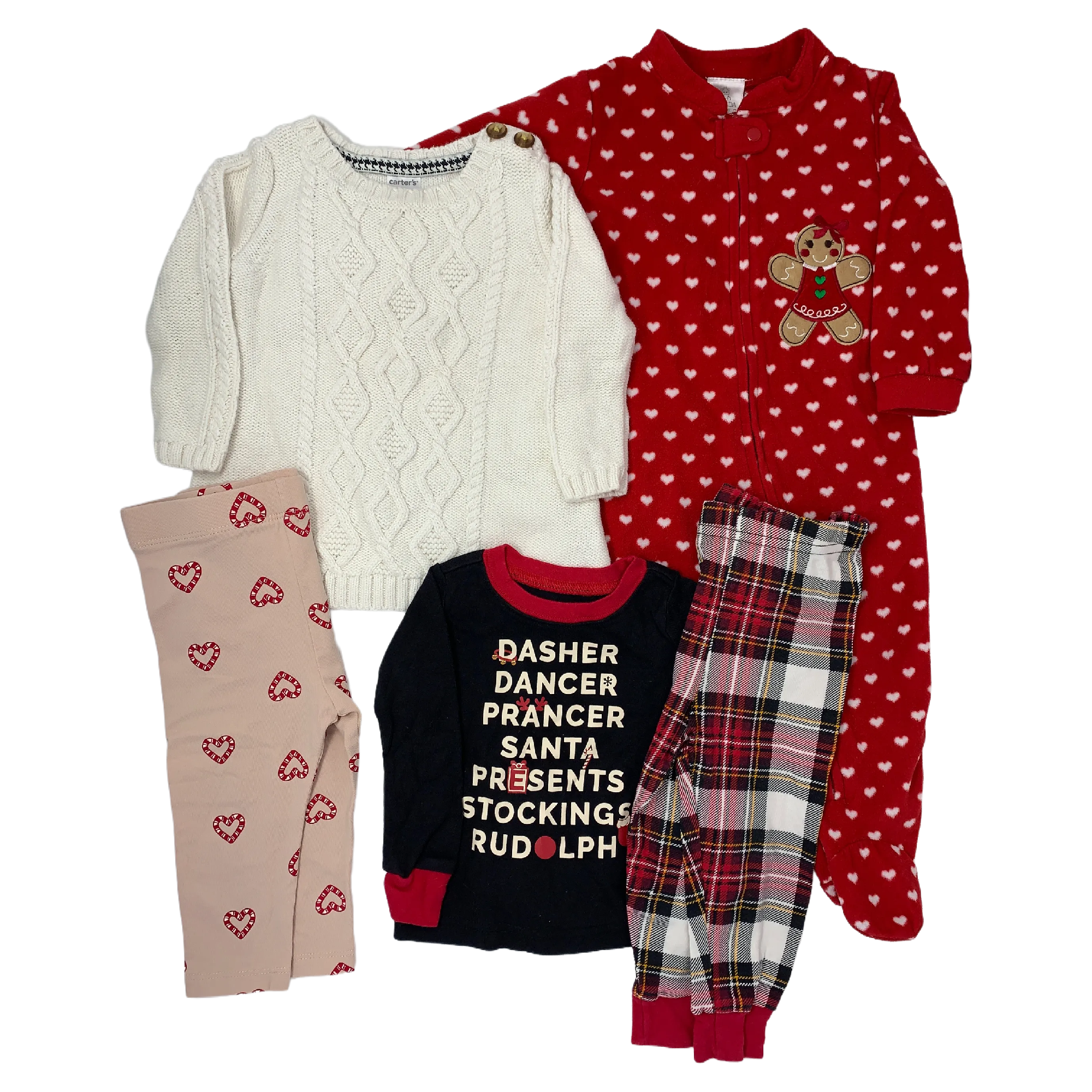 1 Fleece Sleeper, 1 Knit Sweater Dress, 1 Long Sleeve Top, 2 Pairs of Pants.