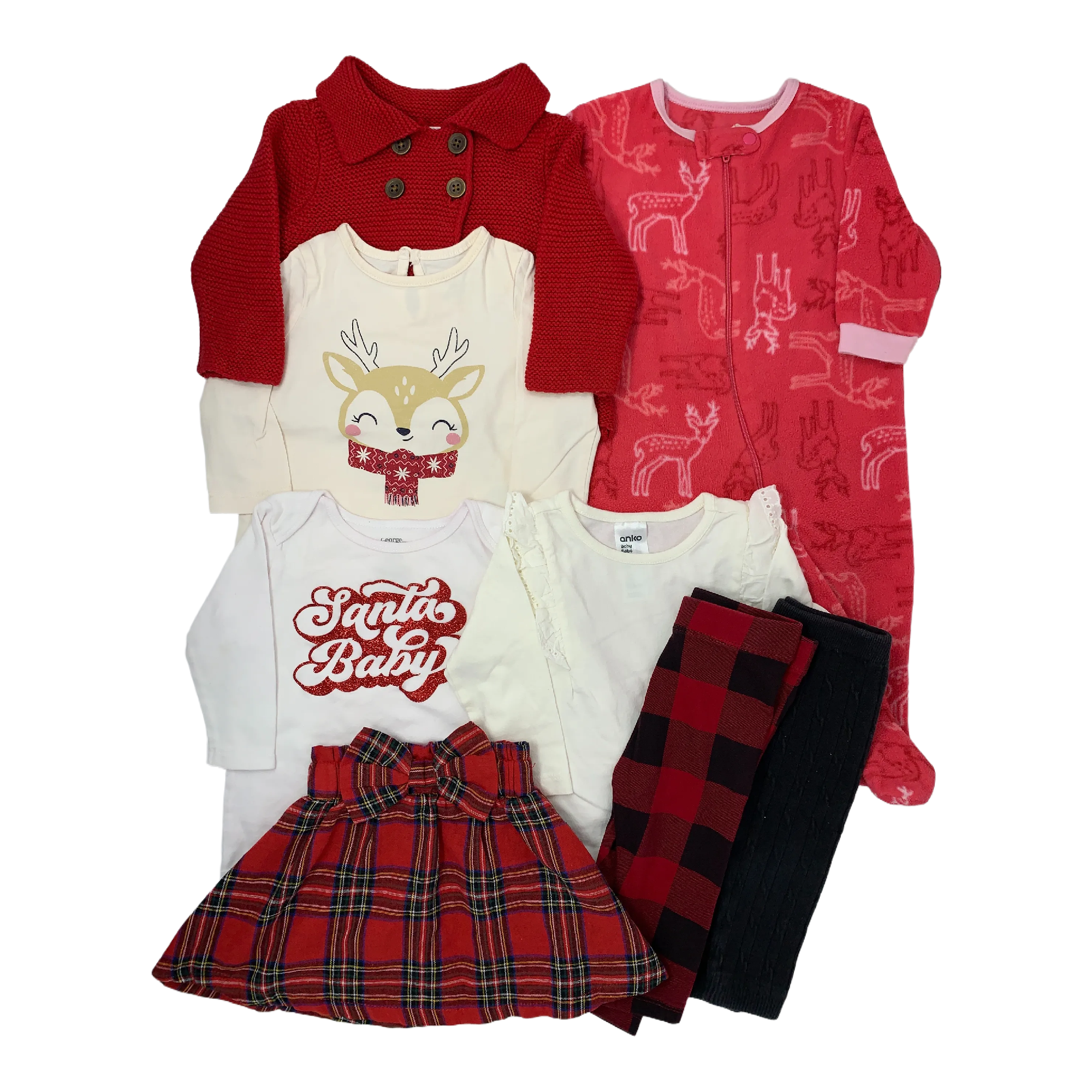 1 Fleece Sleeper, 1 Knit Sweater, 2 Long Sleeve Tops, 1 Long Sleeve Onesie, 1 Skirt, 2 Pairs of Pants.