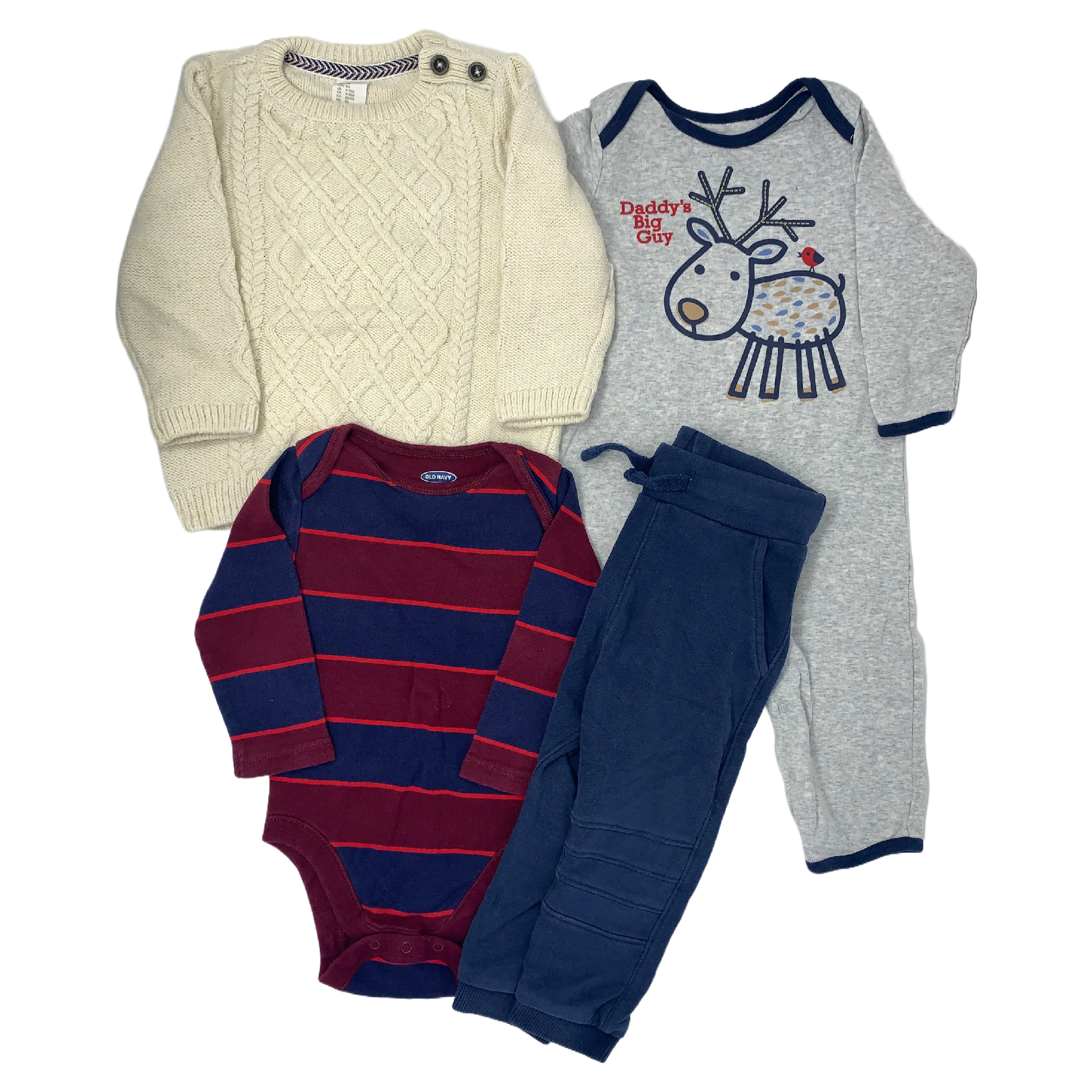 1 Footless Sleeper. 1 Knit Sweater, 1 Long Sleeve Onesie and 1 Pair of Pants.